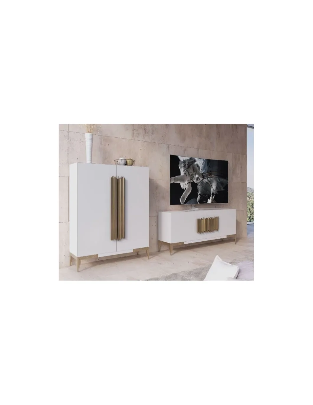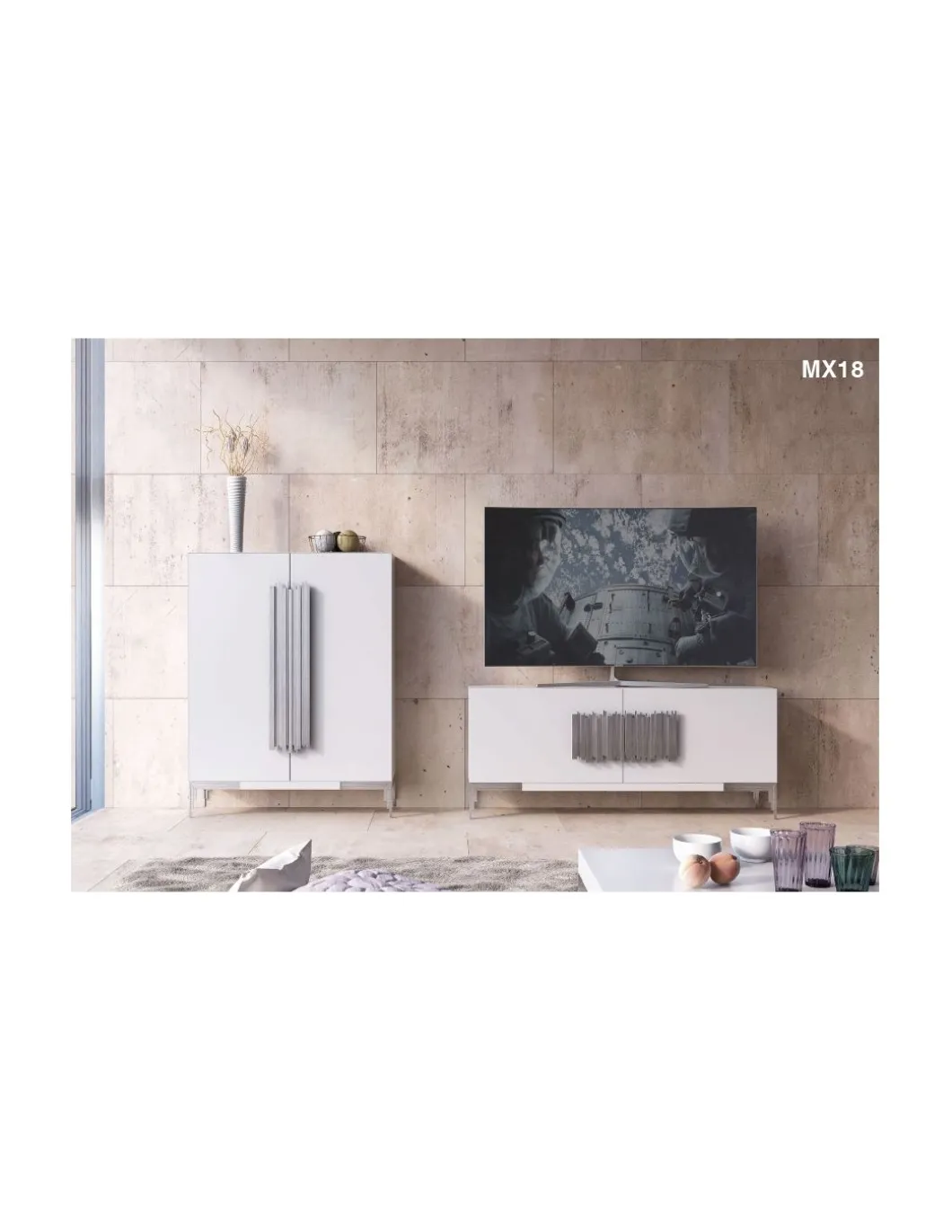 La composición de salón PR01 tiene un diseño innovador en el que se mezcla el lacado blanco mate 120 con detalles cromados dando al mueble una gran personalidad. Una gran alternativa para tu salón en cuanto a tendencia.