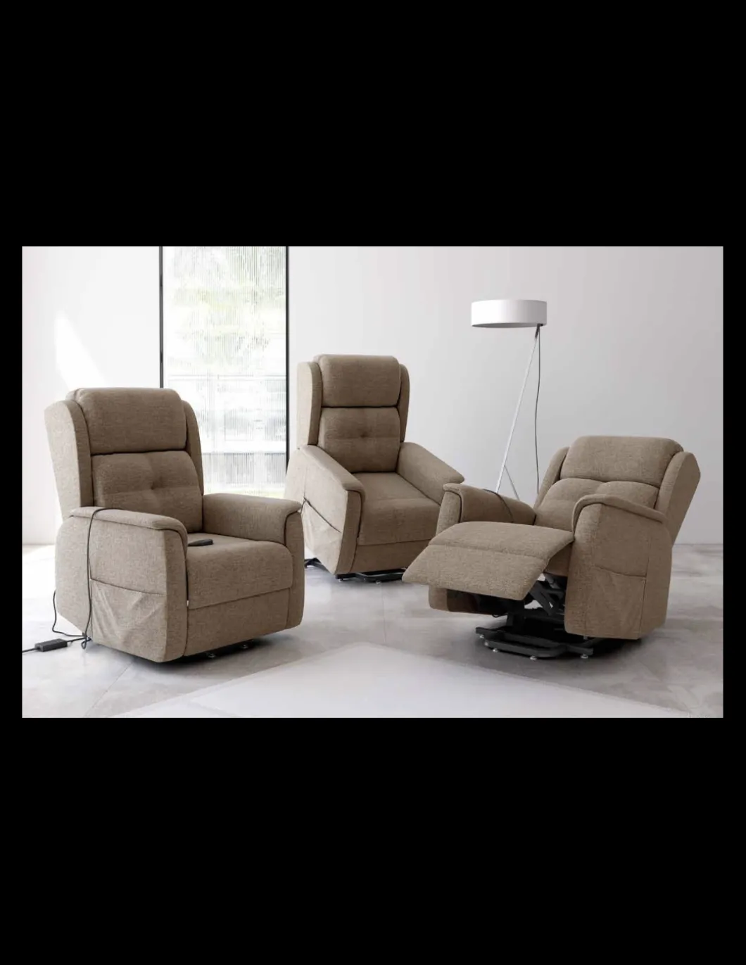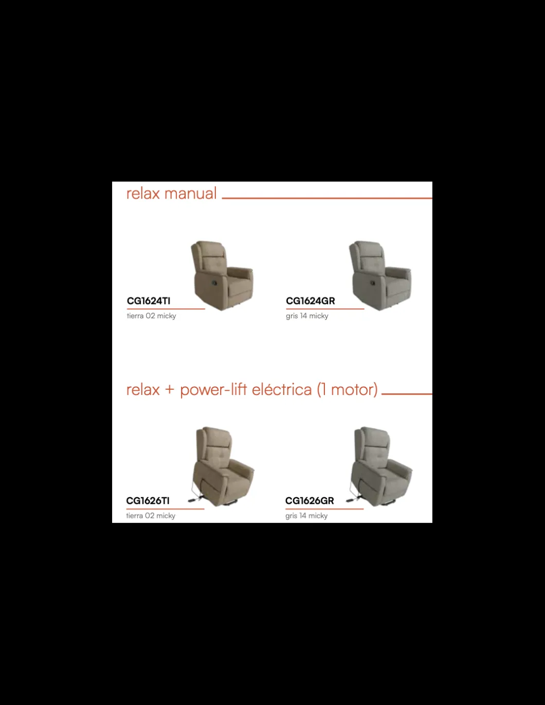 Butaca tapizada. Relax manual o relax + power-lift eléctrica. Estructura metálica negra