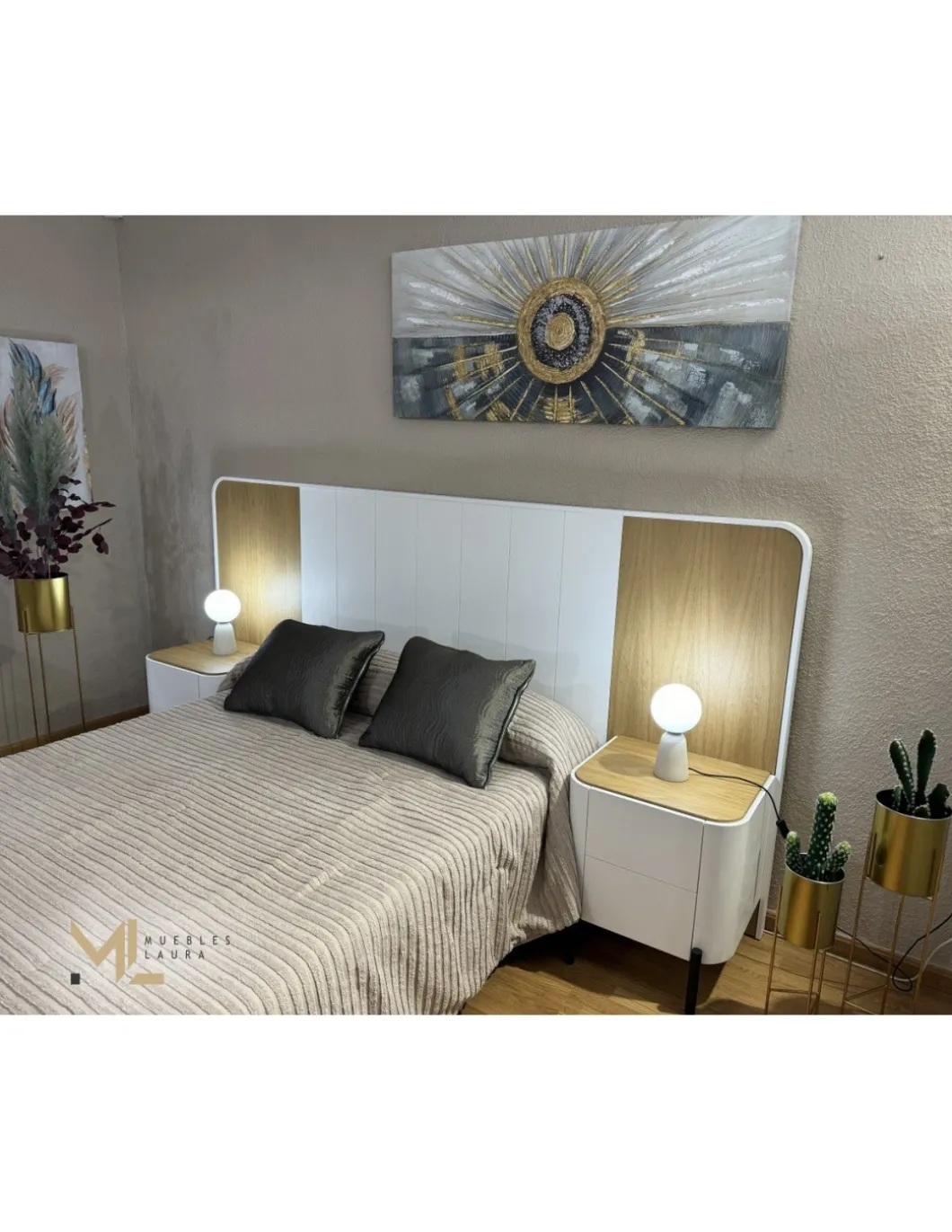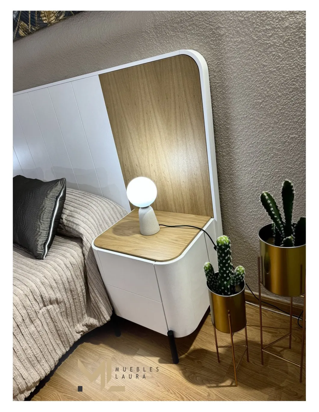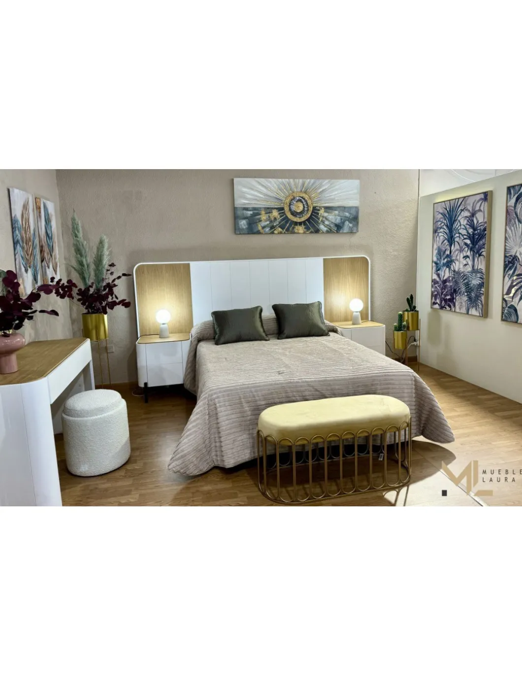 Cabezal de Matrimonio 288m*140m + 2 mesitas 55cm + tocador 120cm con espejo + Puff.