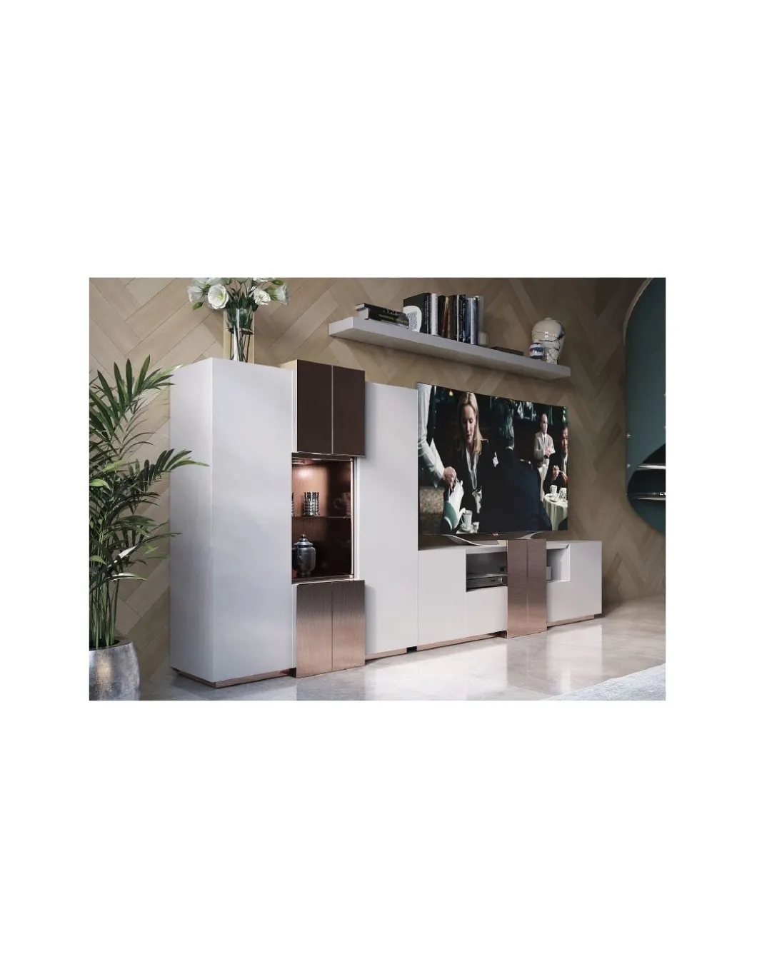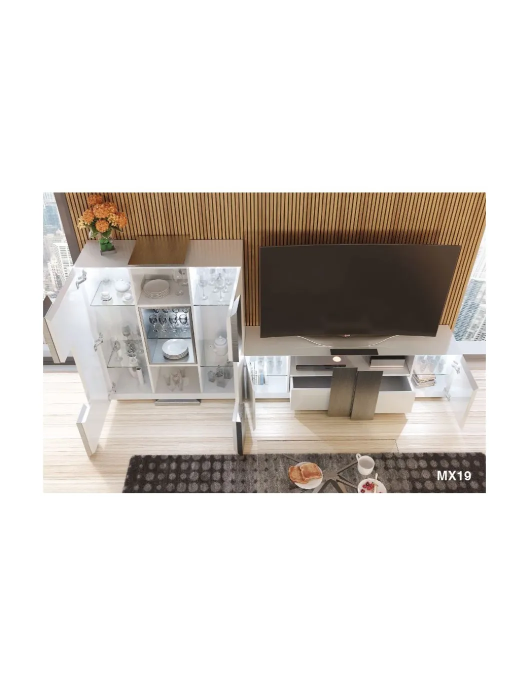 La composición de salón PR01 tiene un diseño innovador en el que se mezcla el lacado blanco mate 120 con detalles cromados dando al mueble una gran personalidad. Una gran alternativa para tu salón en cuanto a tendencia.