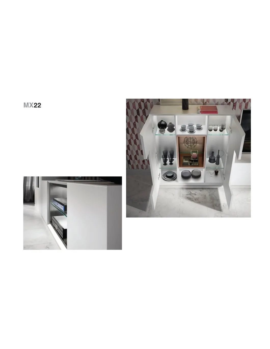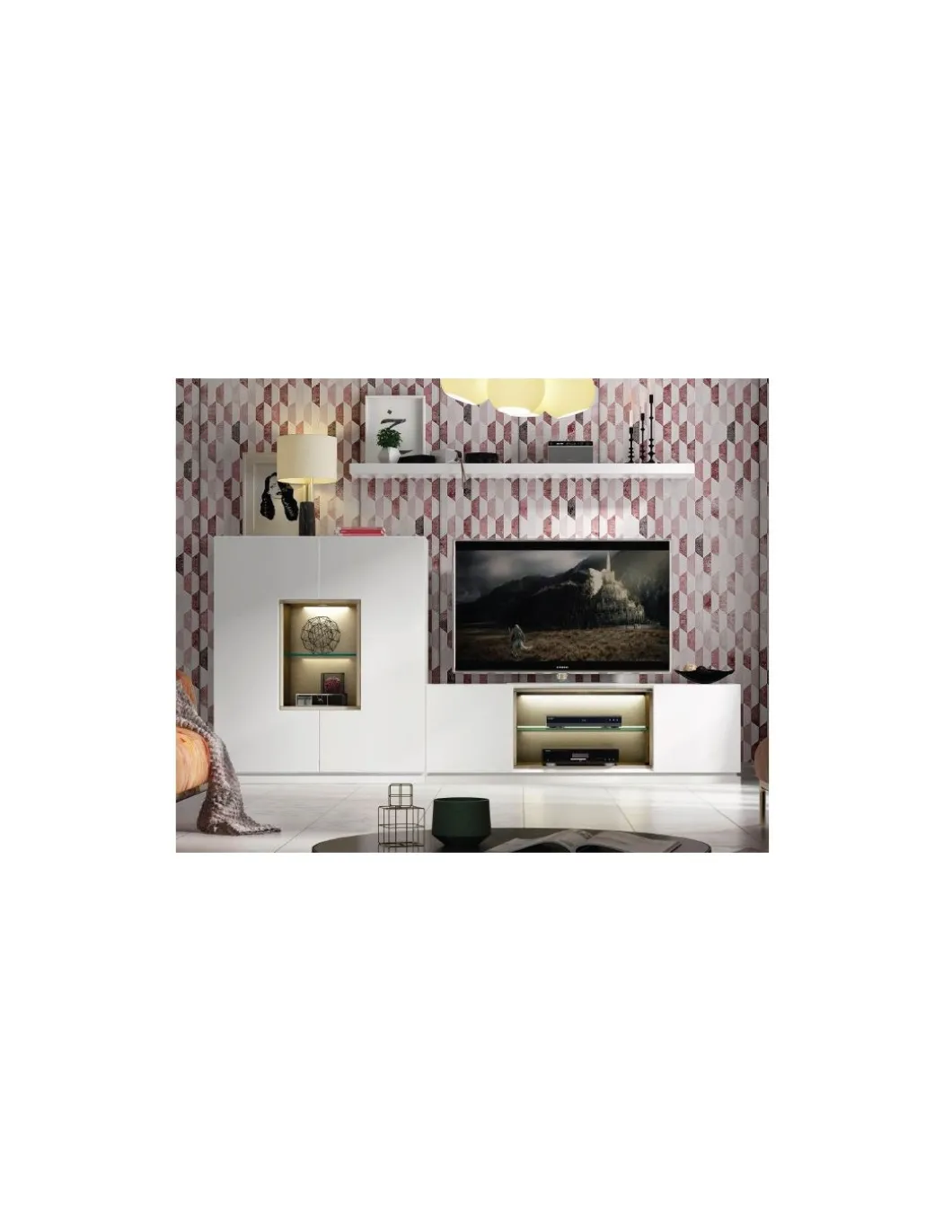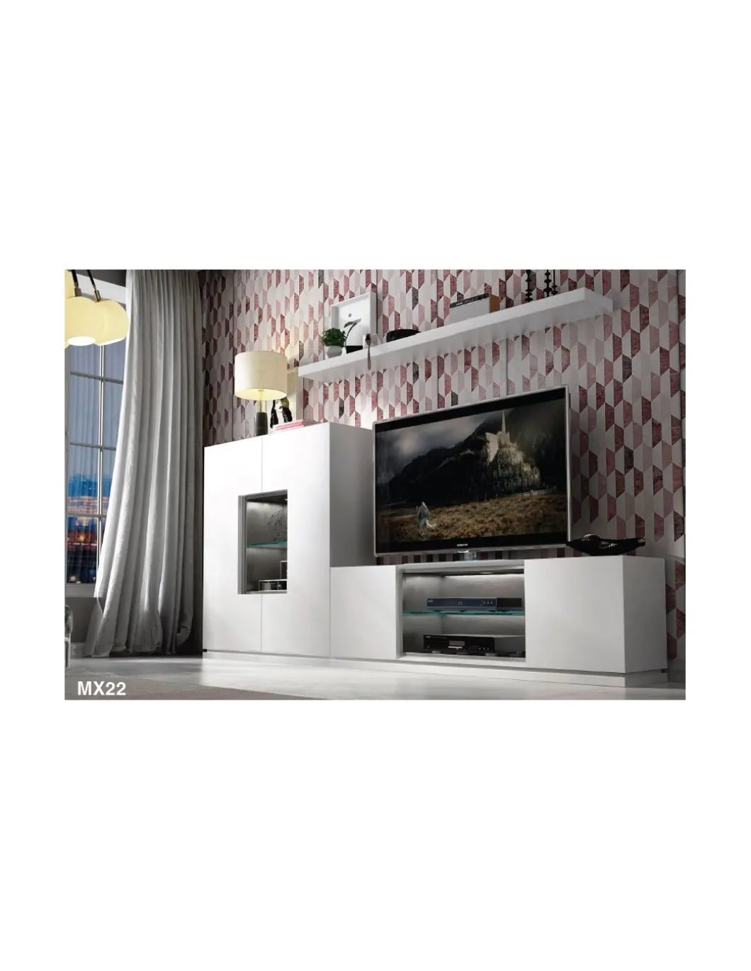 La composición de salón PR01 tiene un diseño innovador en el que se mezcla el lacado blanco mate 120 con detalles cromados dando al mueble una gran personalidad. Una gran alternativa para tu salón en cuanto a tendencia.