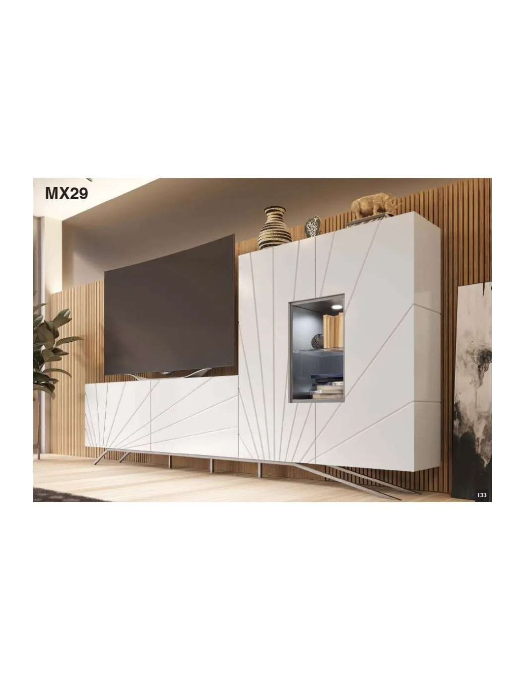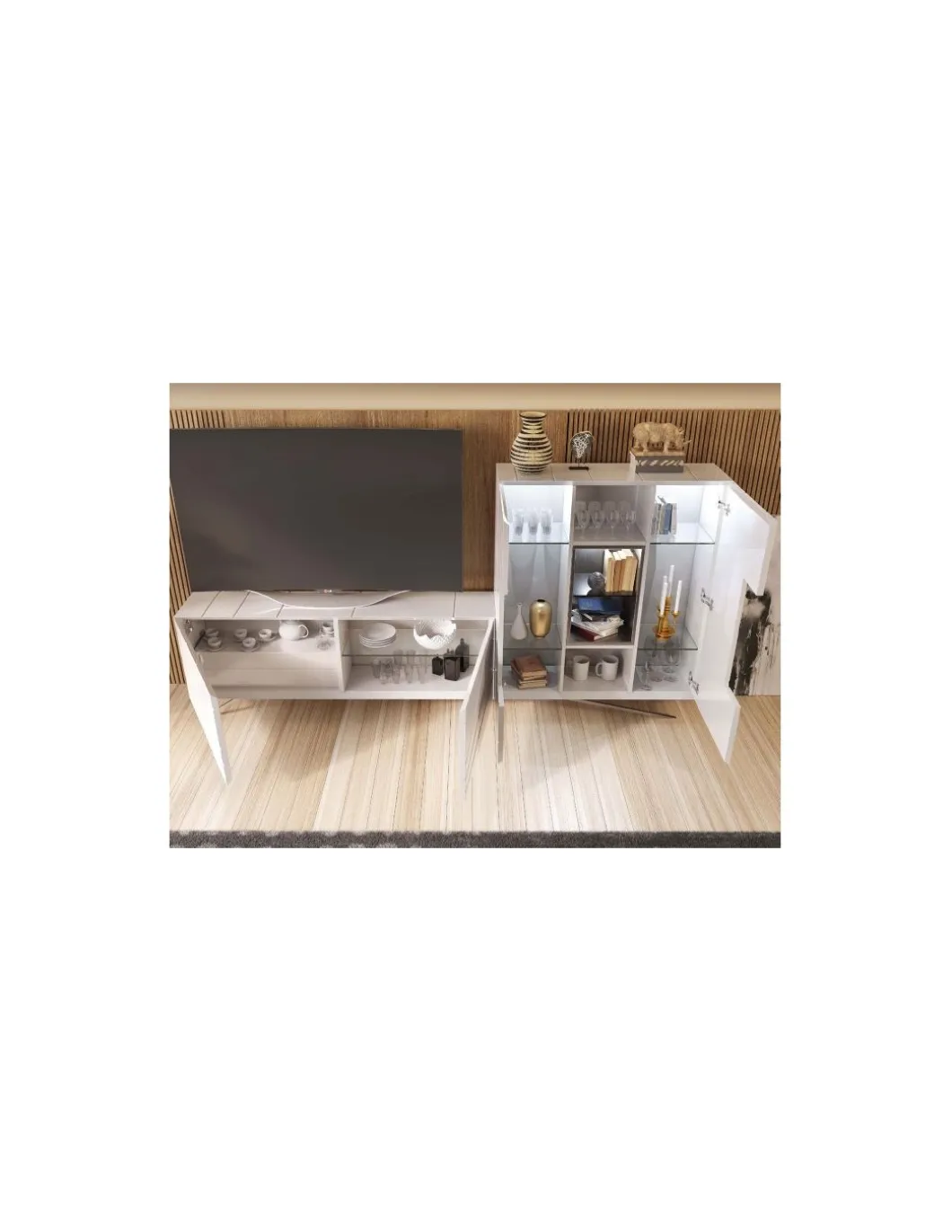 La composición de salón PR01 tiene un diseño innovador en el que se mezcla el lacado blanco mate 120 con detalles cromados dando al mueble una gran personalidad. Una gran alternativa para tu salón en cuanto a tendencia.