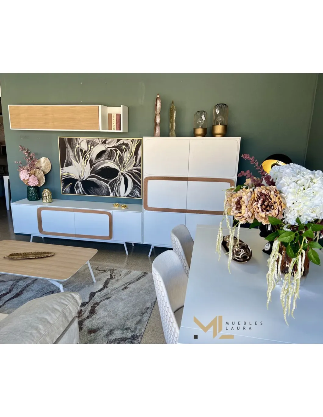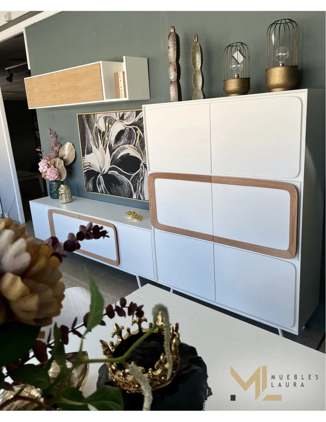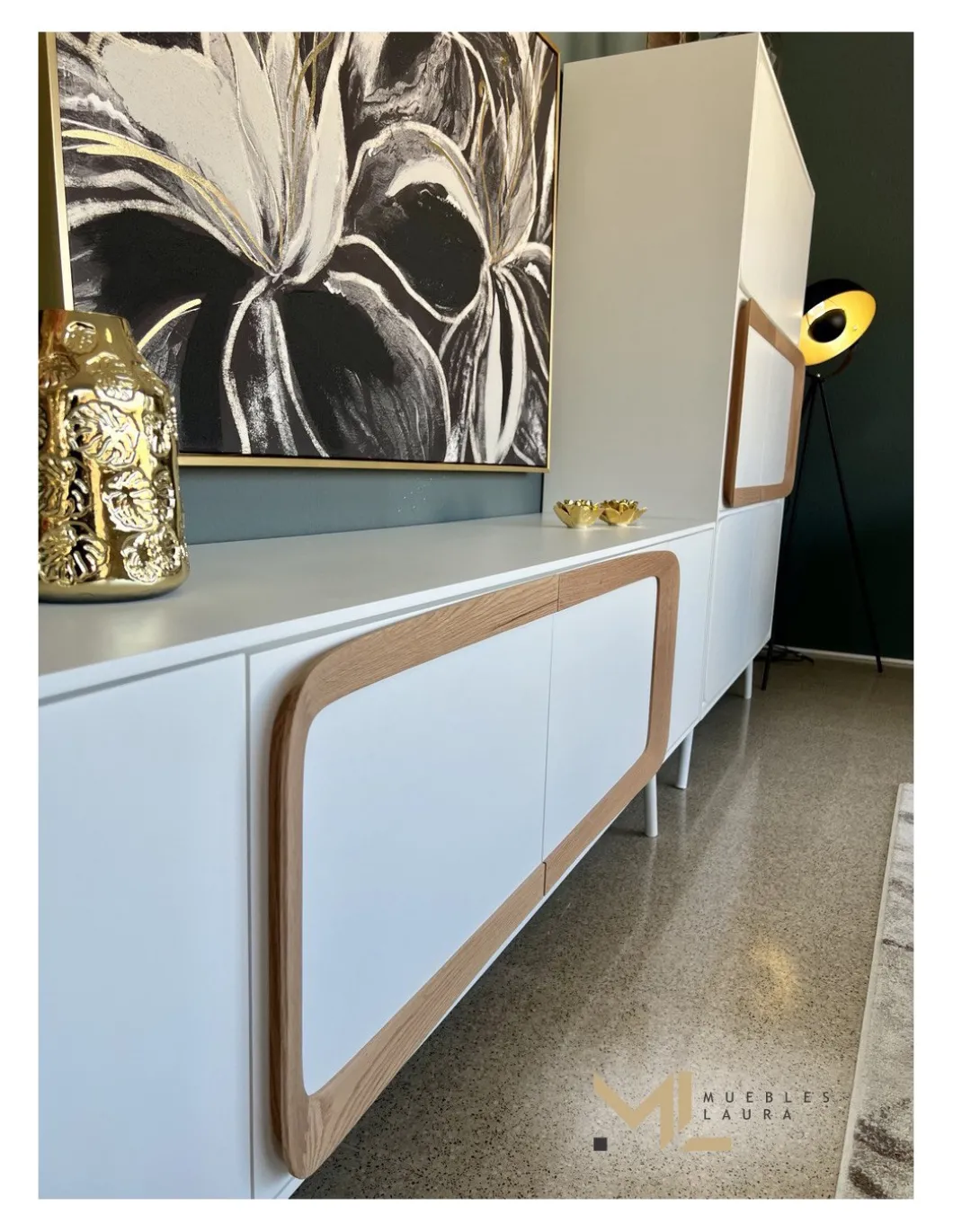 Acabado en lacado blanco y chapa natural en roble blanqueado.