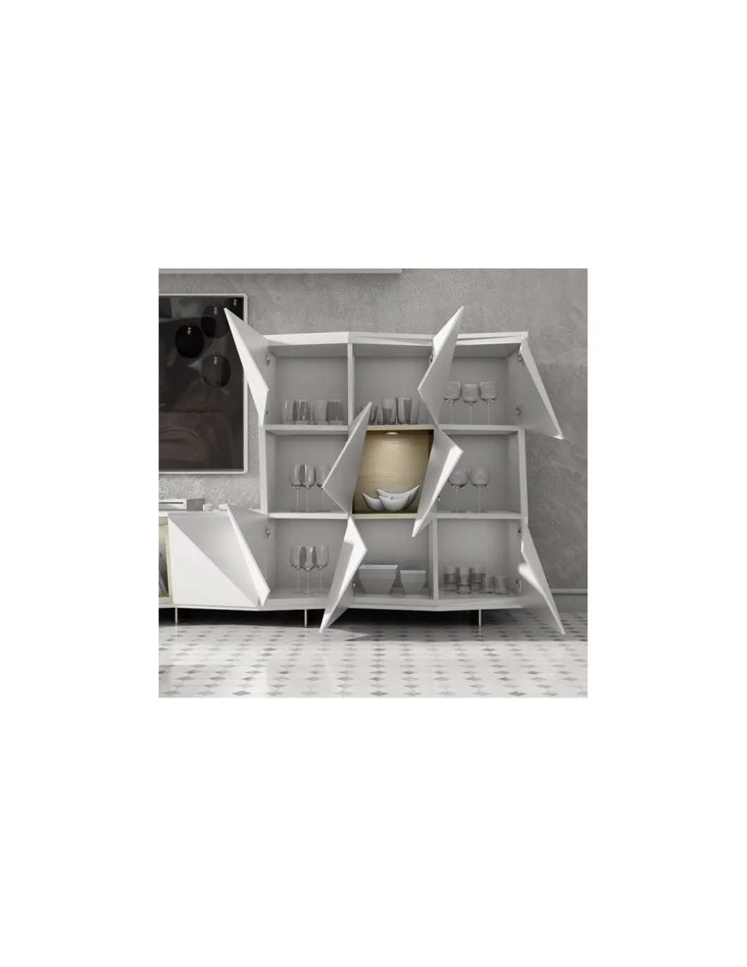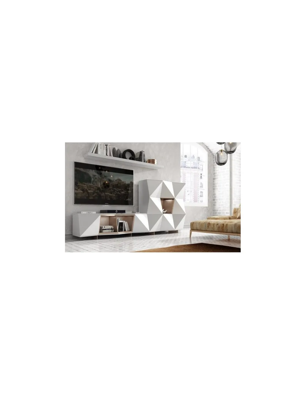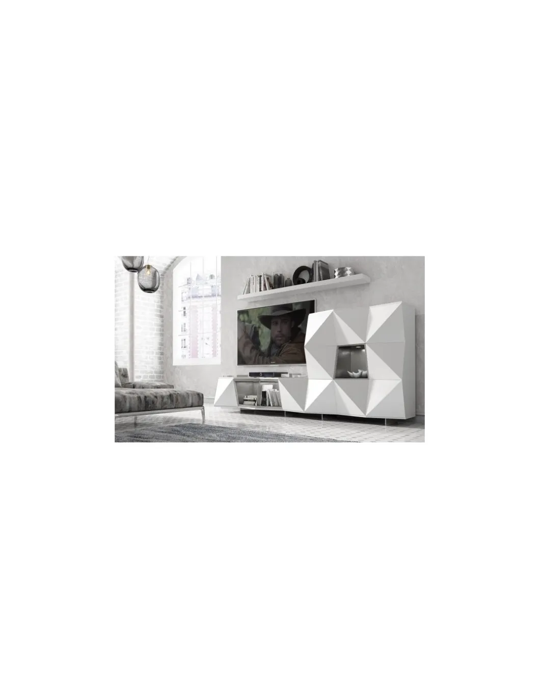 La composición de salón Promo 03 tiene un diseño innovador en el que se mezcla el lacado blanco mate 120 con detalles cromados dando al mueble una gran personalidad. Una gran alternativa para tu salón en cuanto a tendencia.