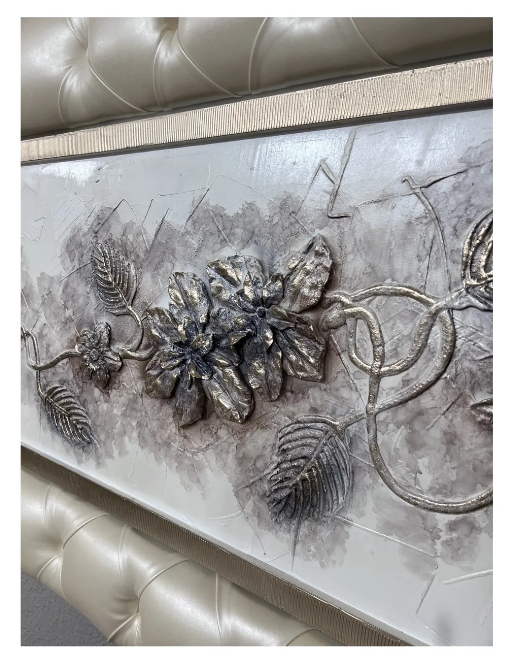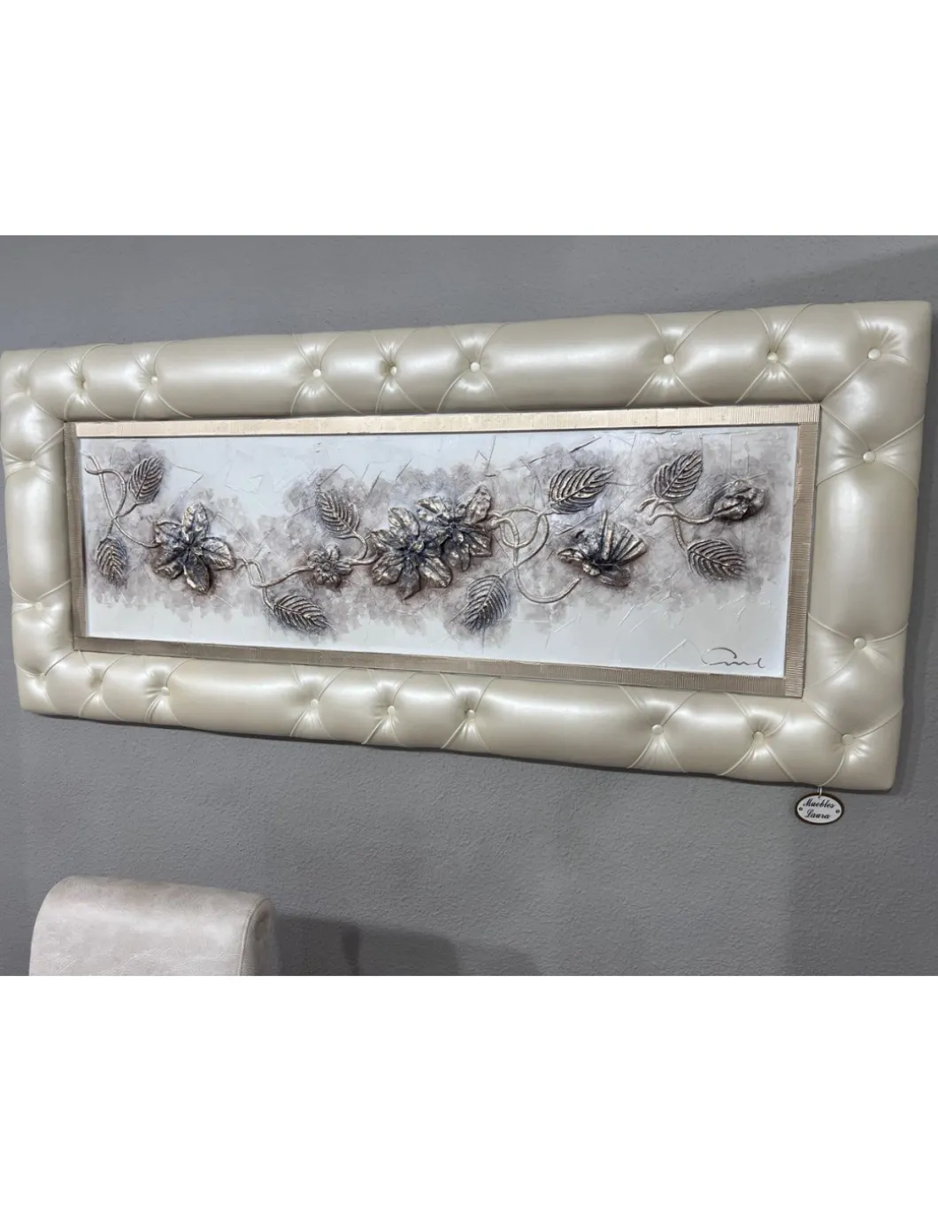 Cuadro moldura tapizada en polipiel con capitone, pintura con relieves.