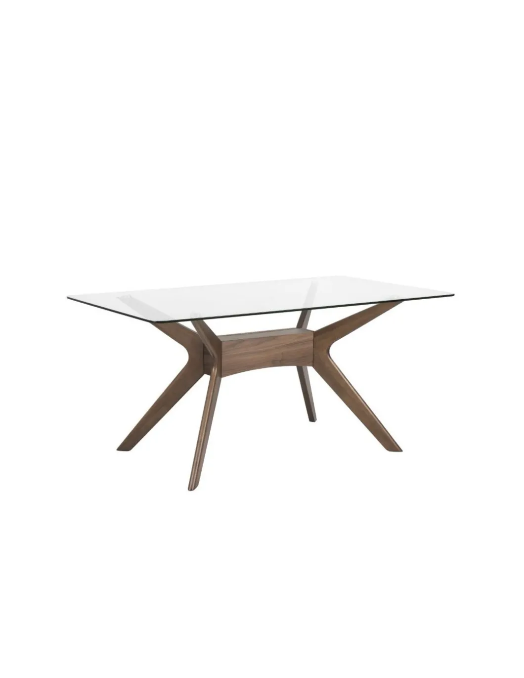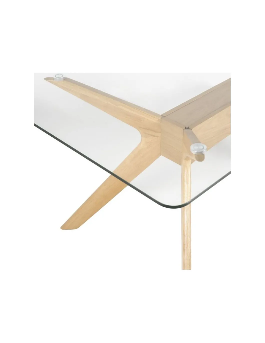 Mesa fija con tapa de cristal templado de 1 cm de espesor y patas de madera acabada en roble o nogal, una combinación que crea una mesa elegante y original.