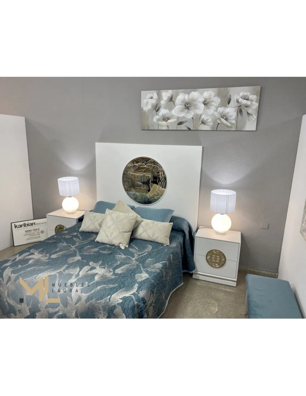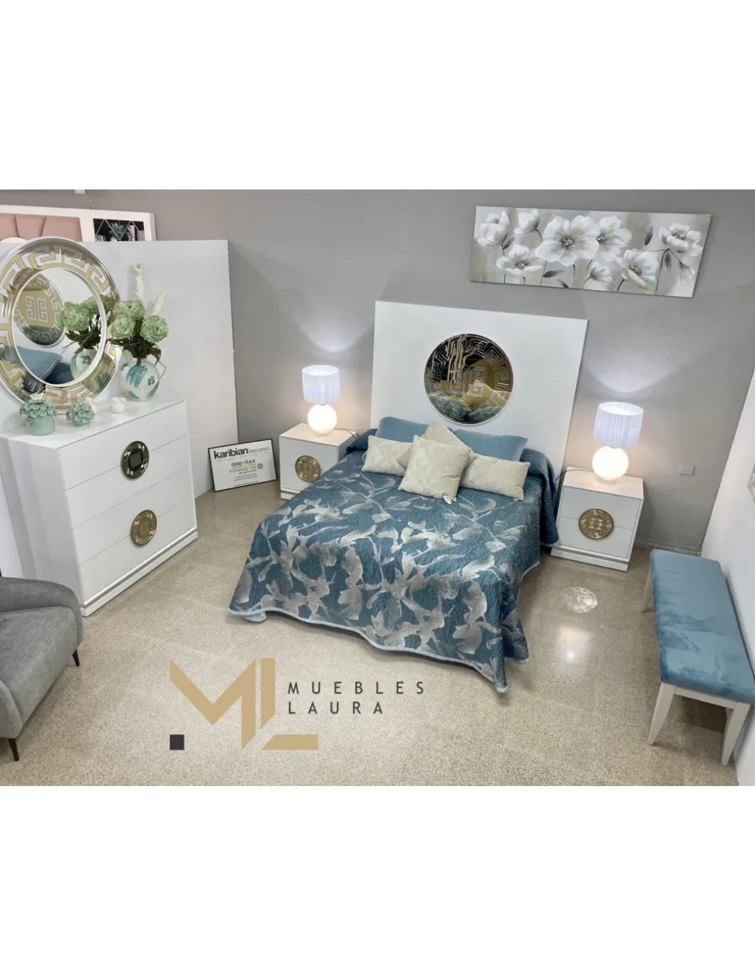 Dormitorio de matrimonio compuesto por Cabezal GRECA GOLACH 150 + 2 mesitas + cómoda y espejo GOLACH.