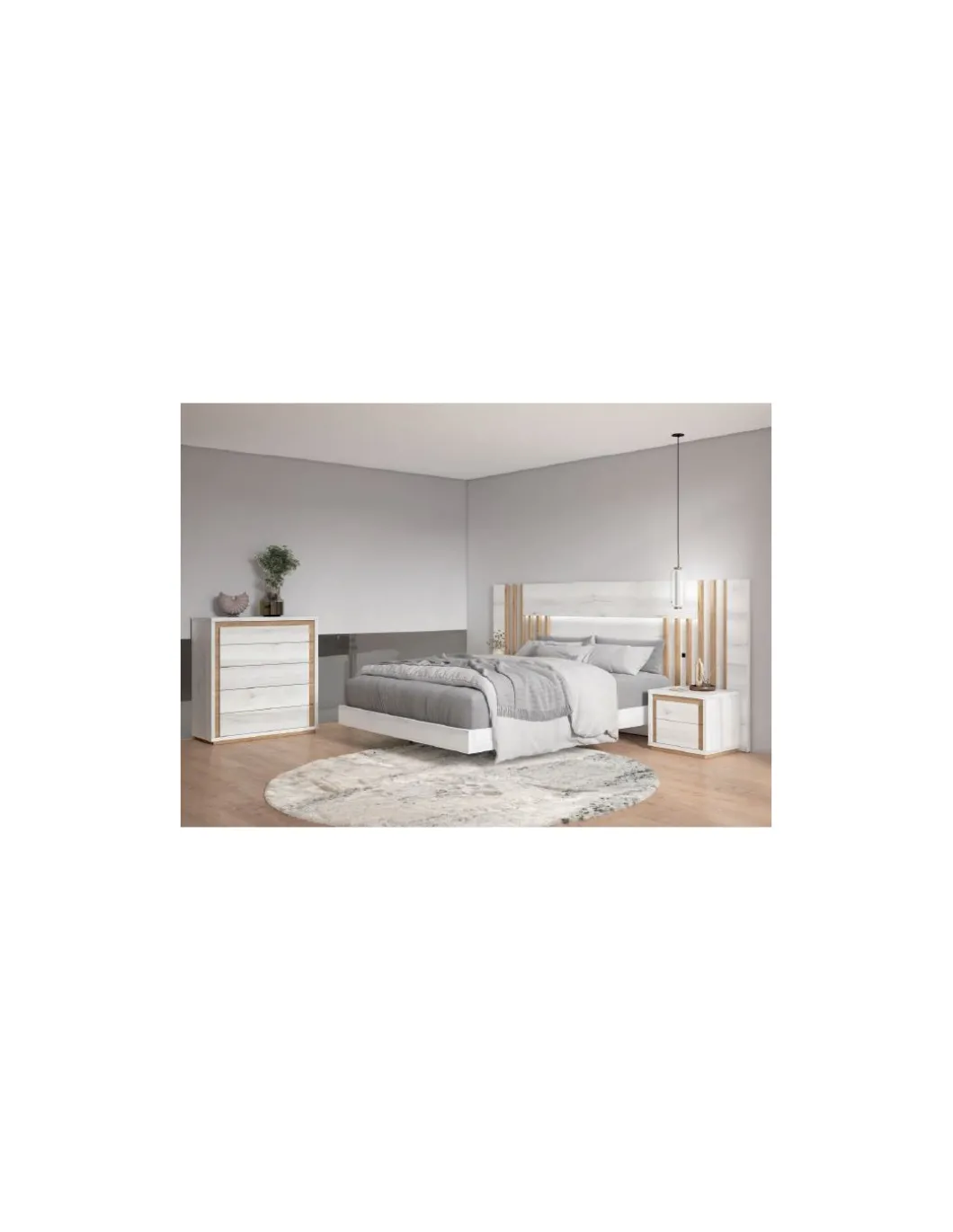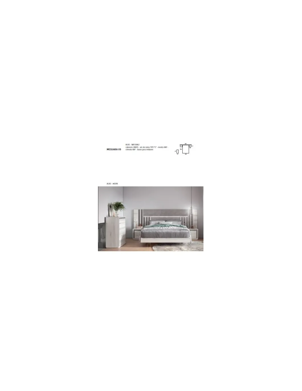 Cabezal MESSARA de 291cm + Mesitas de 53cm modelo KAP + Cómoda KAP 5 cajones de 87cm.