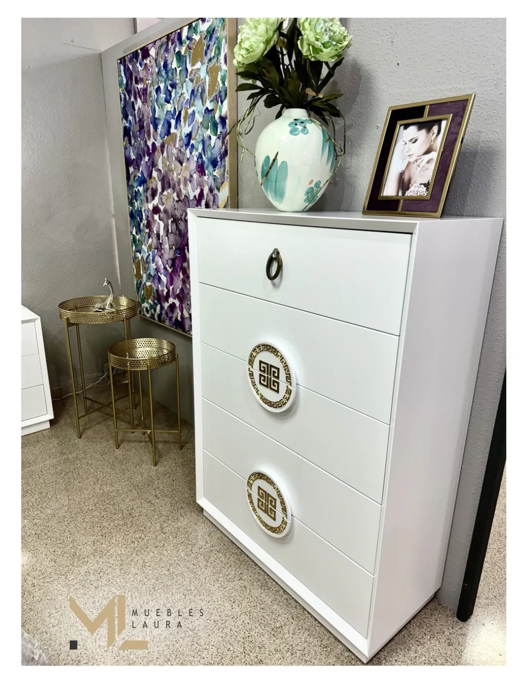 Acabado: Blanco lacado y detalles de metacrilato en oro.