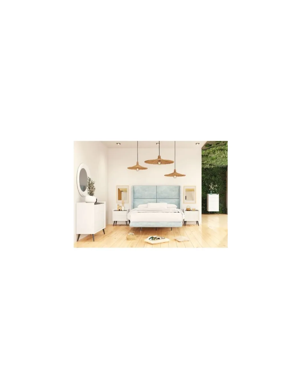 Cabezal tapizado 150 y 2 mesitas, cómoda o sinfonier a elegir con su espejo a juego.
