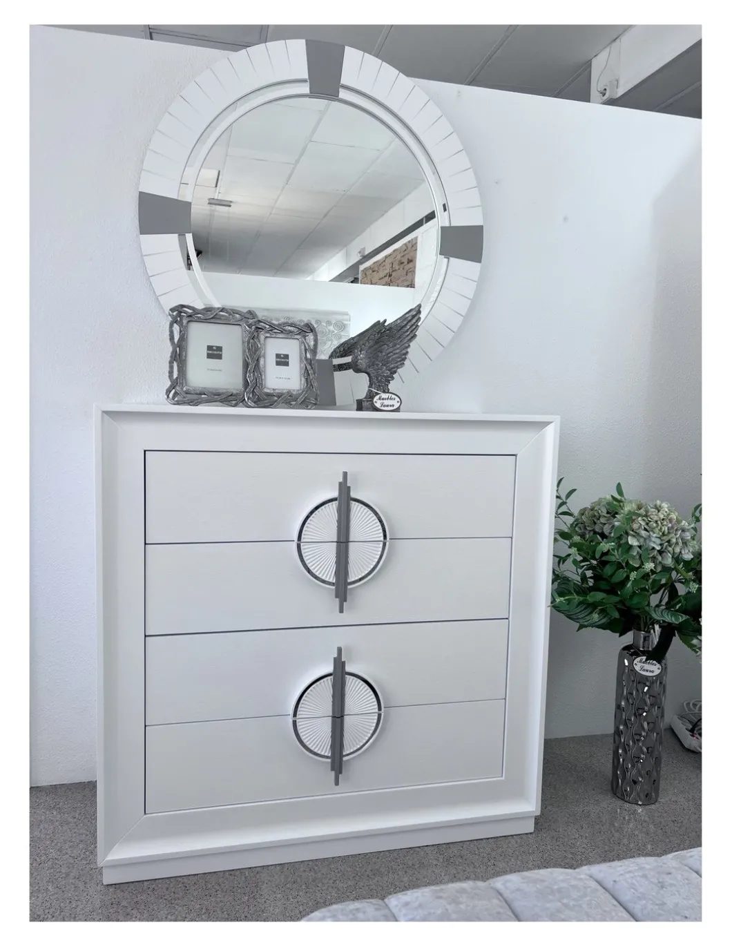 ACABADO BLANCO NIEVE LACADO Y PLATA, TIRADORES CROMADOS.