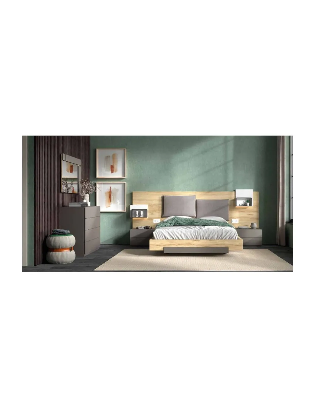 Dormitorio de Matrimonio, cabezal para cama de 150 y mesitas, cómoda y espejo.