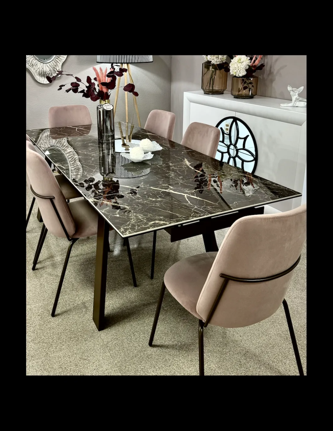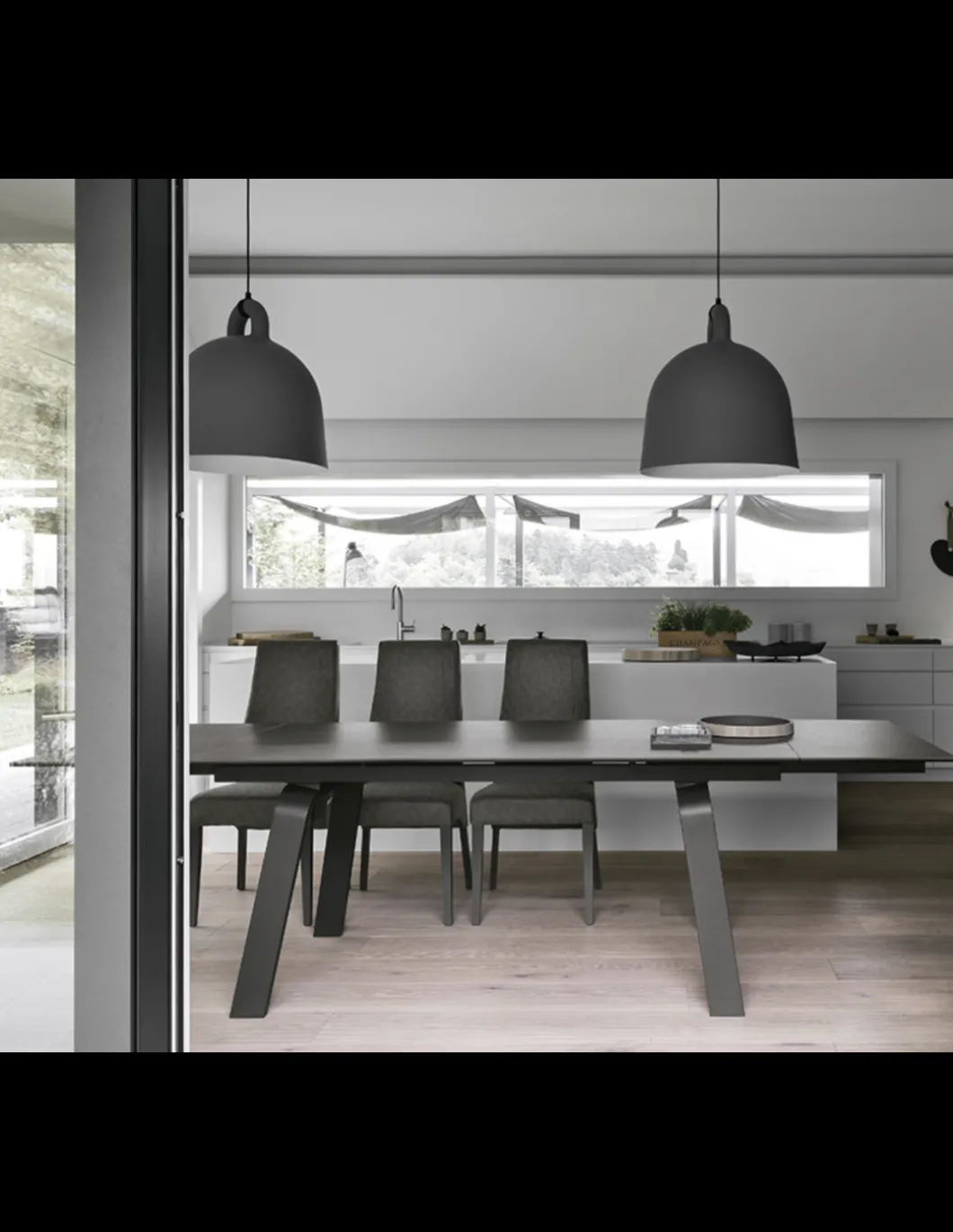 Mesa extensible de 160 a 240 cm. Estructura en metal, encimera disponible en gres opaco o brillante o en cristal templado.