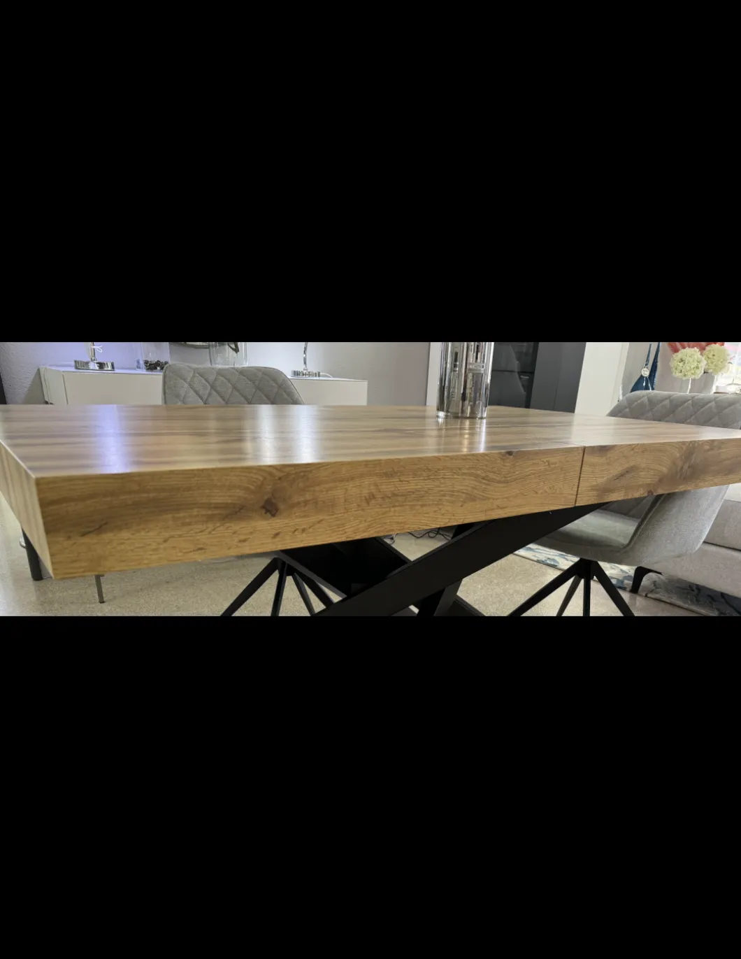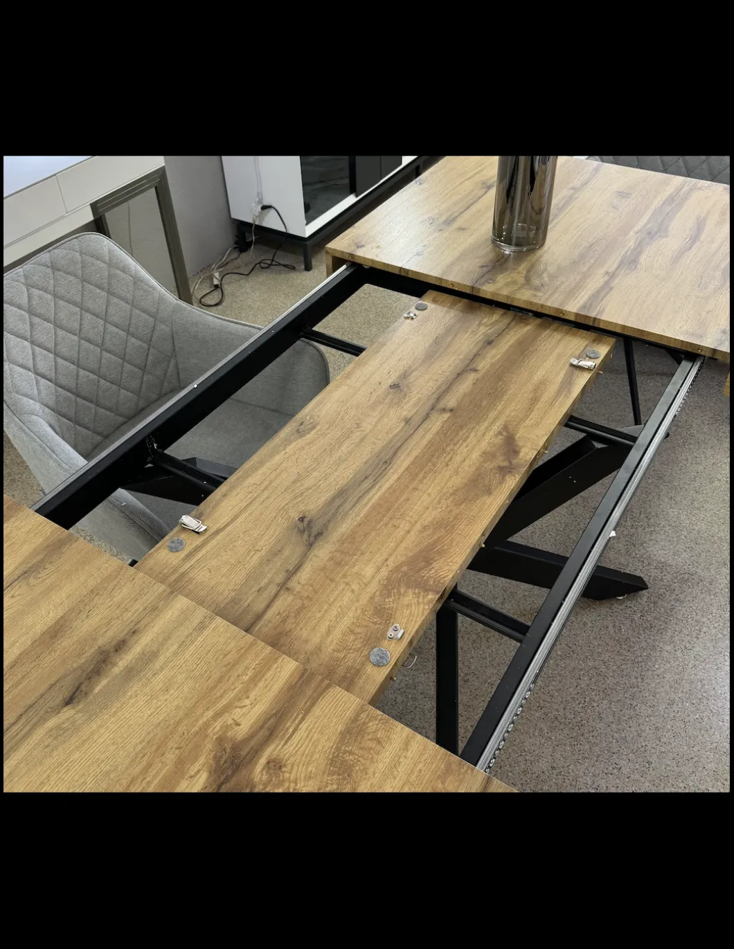 MESA CON DOS EXTENSIBLES QUE SE RECOGEN DENTRO DE LA MESA, VINILADO EN MADERA TIPO ROBLE. PATAS NEGRO MATE.