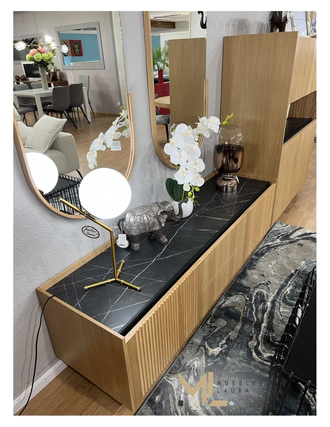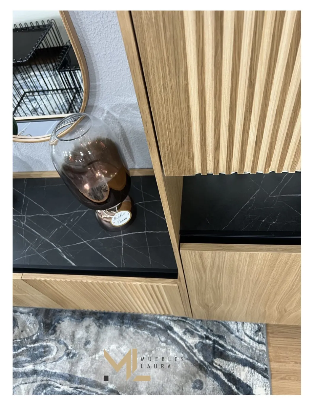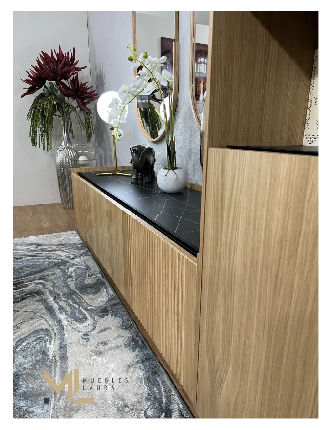 ACABADO EN CHAPA DE ROBLE NATURAL Y TAPAS EN EFECTO MÁRMOL NEGRO.