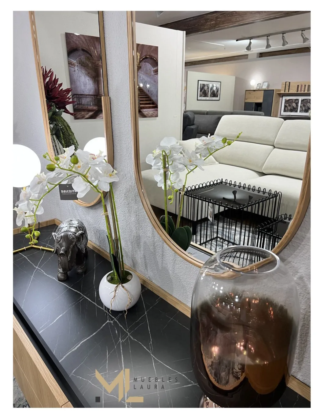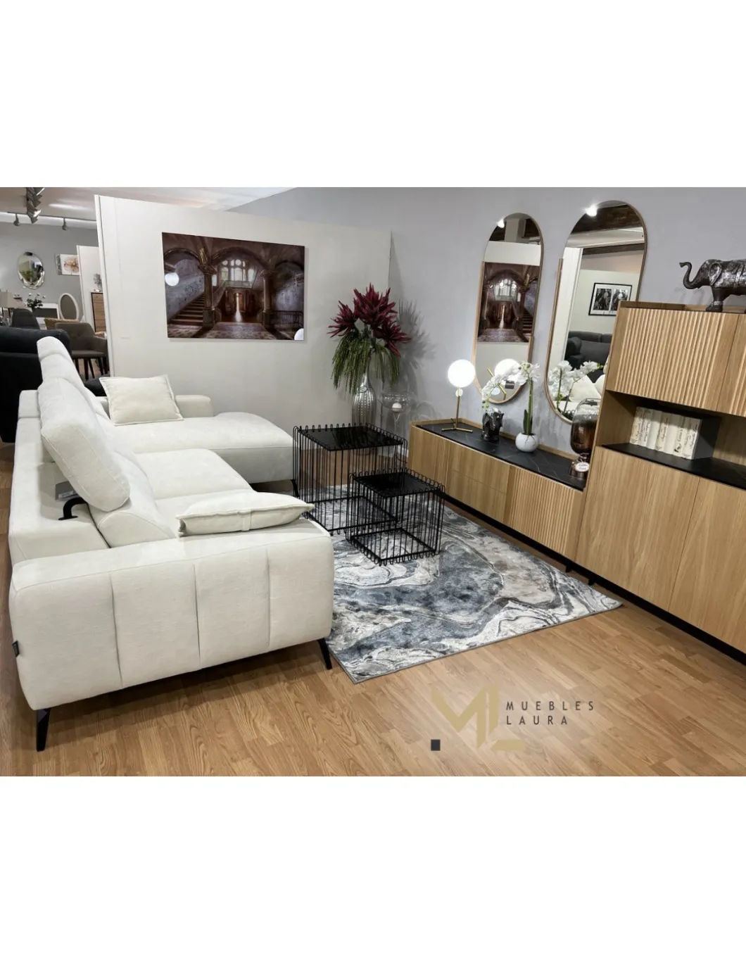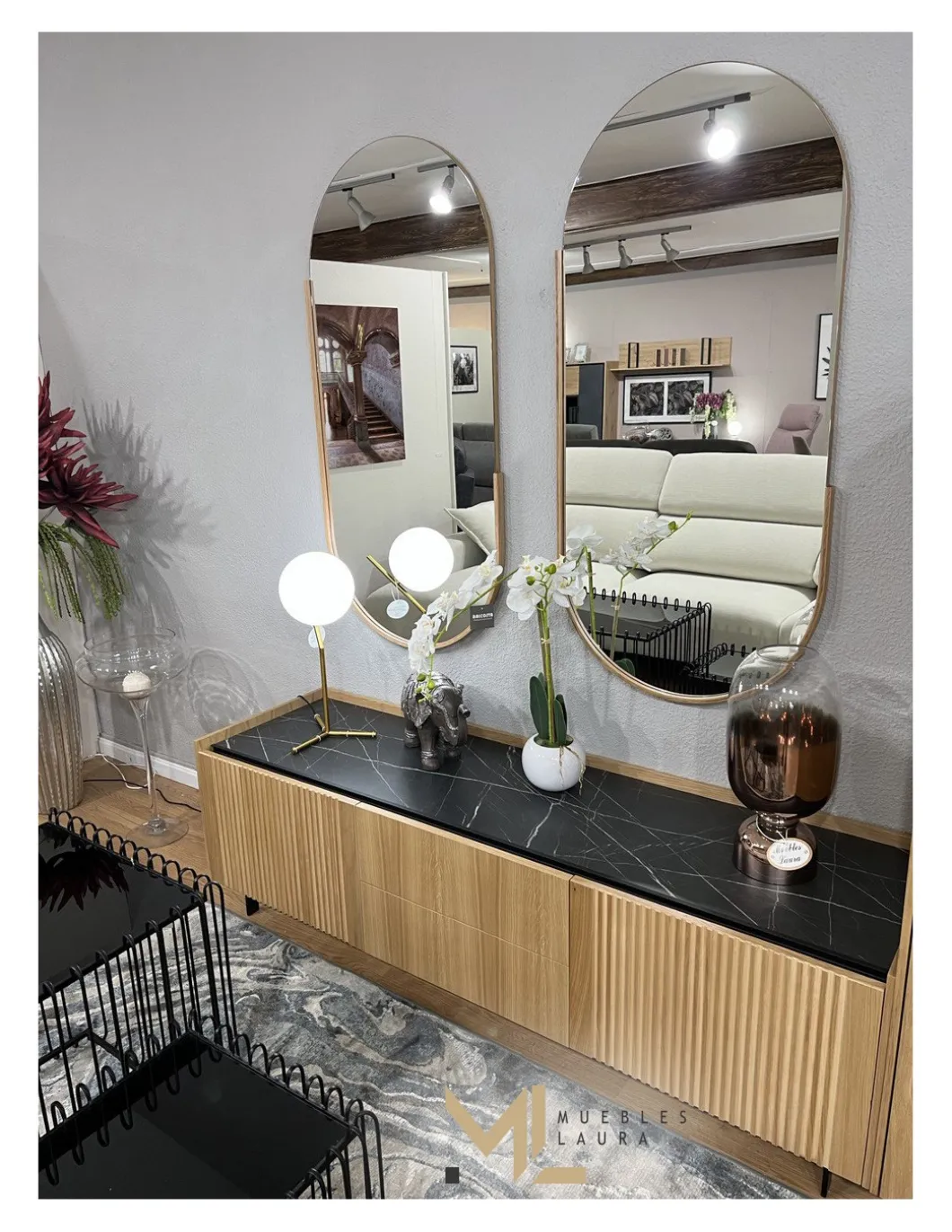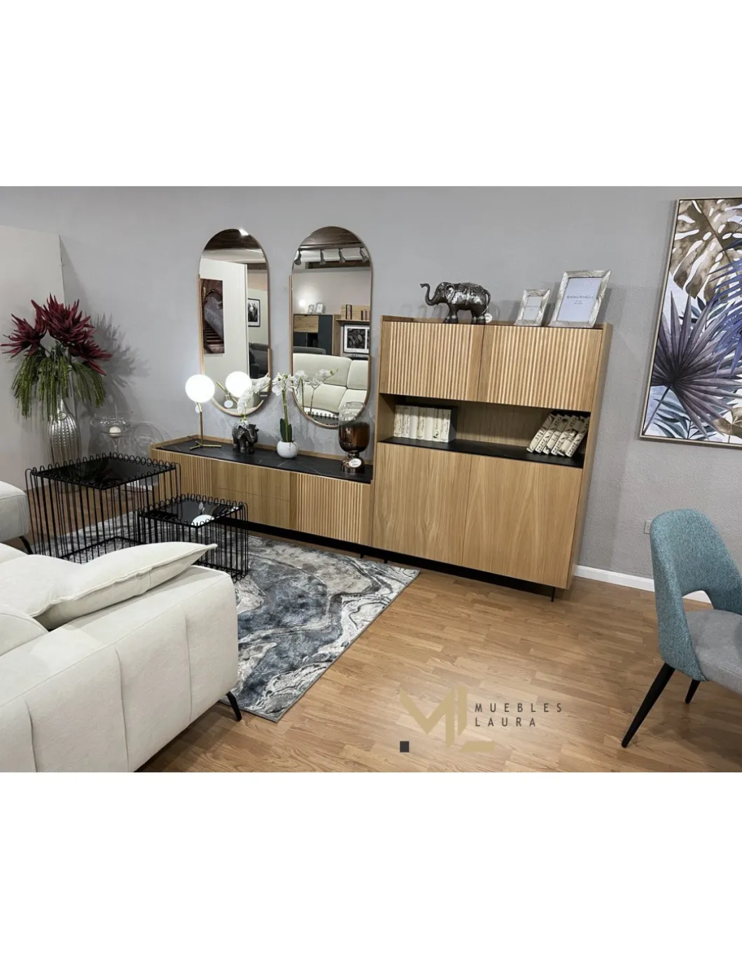 ACABADO EN CHAPA DE ROBLE NATURAL Y TAPAS EN EFECTO MÁRMOL NEGRO.