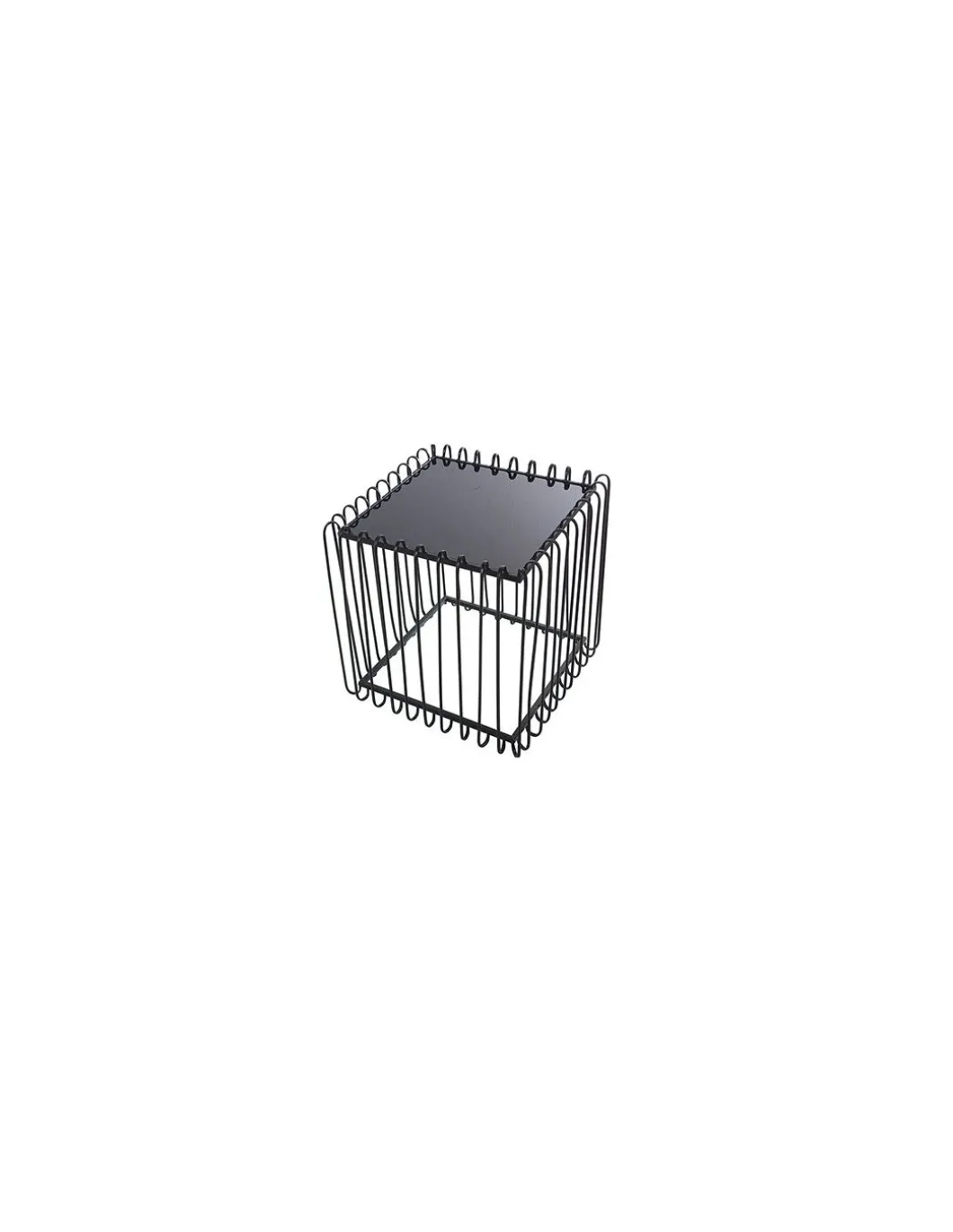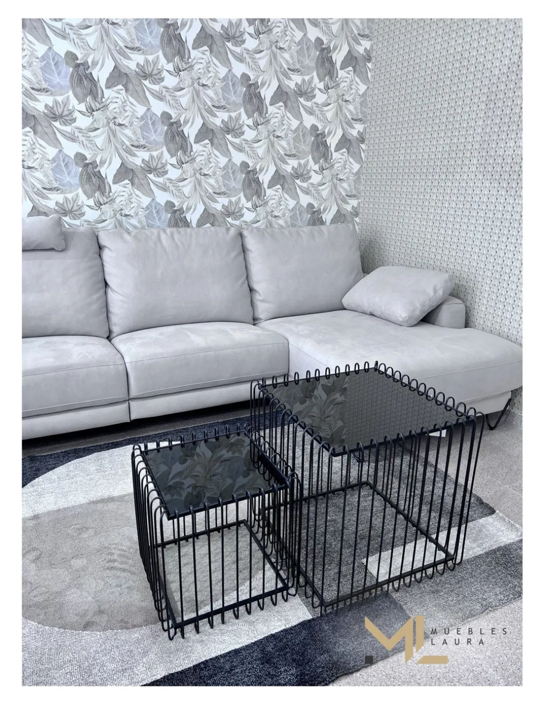 Conjunto de mesas de centro en cristal y metal negro.