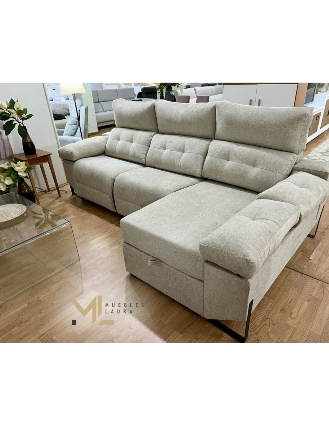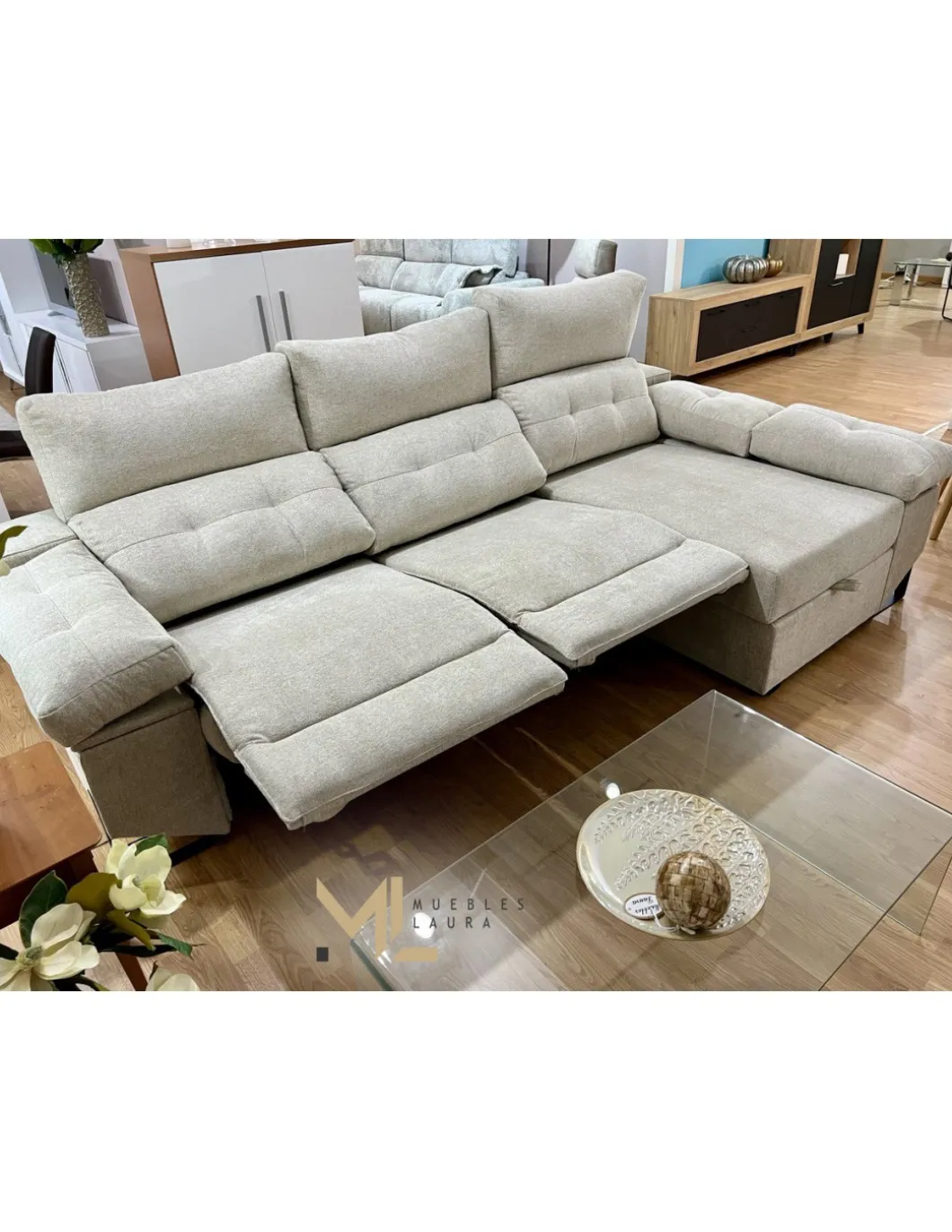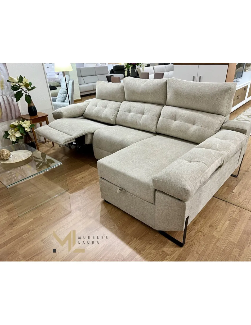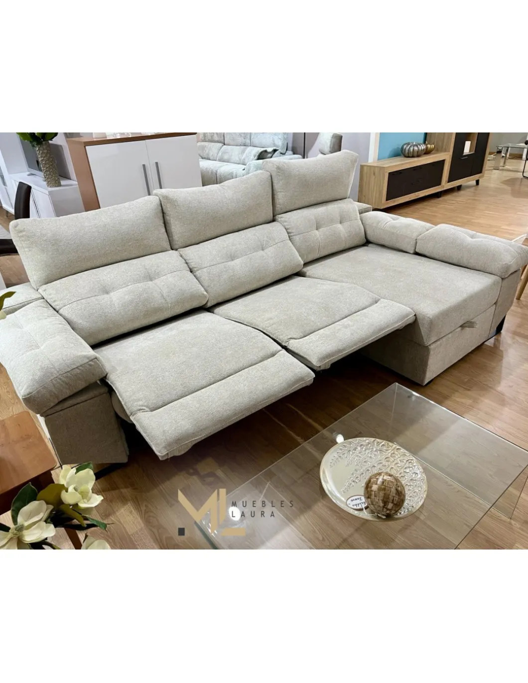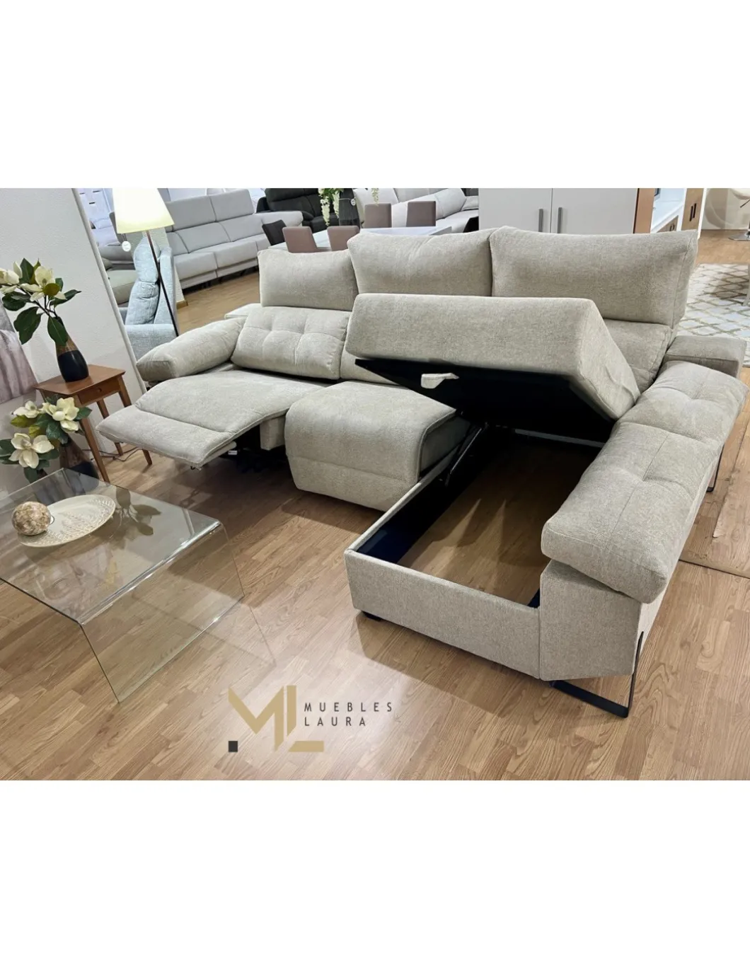 Sofá chaislongue modelo SAURON, 2.90m 2 asientos relax eléctricos + chaislongue con arcón abatible.