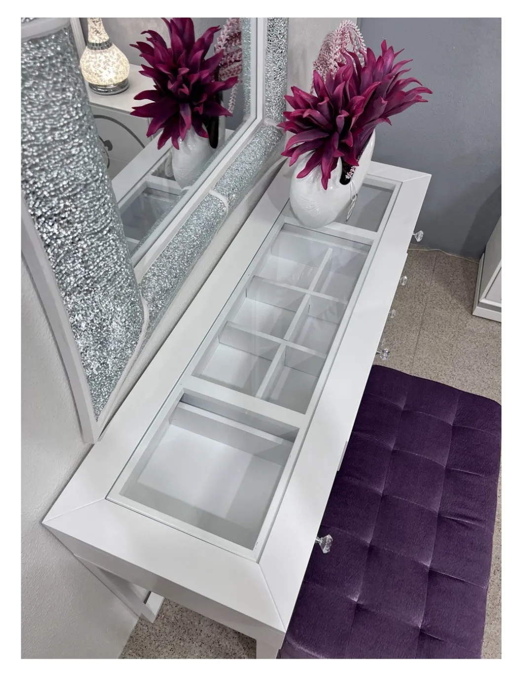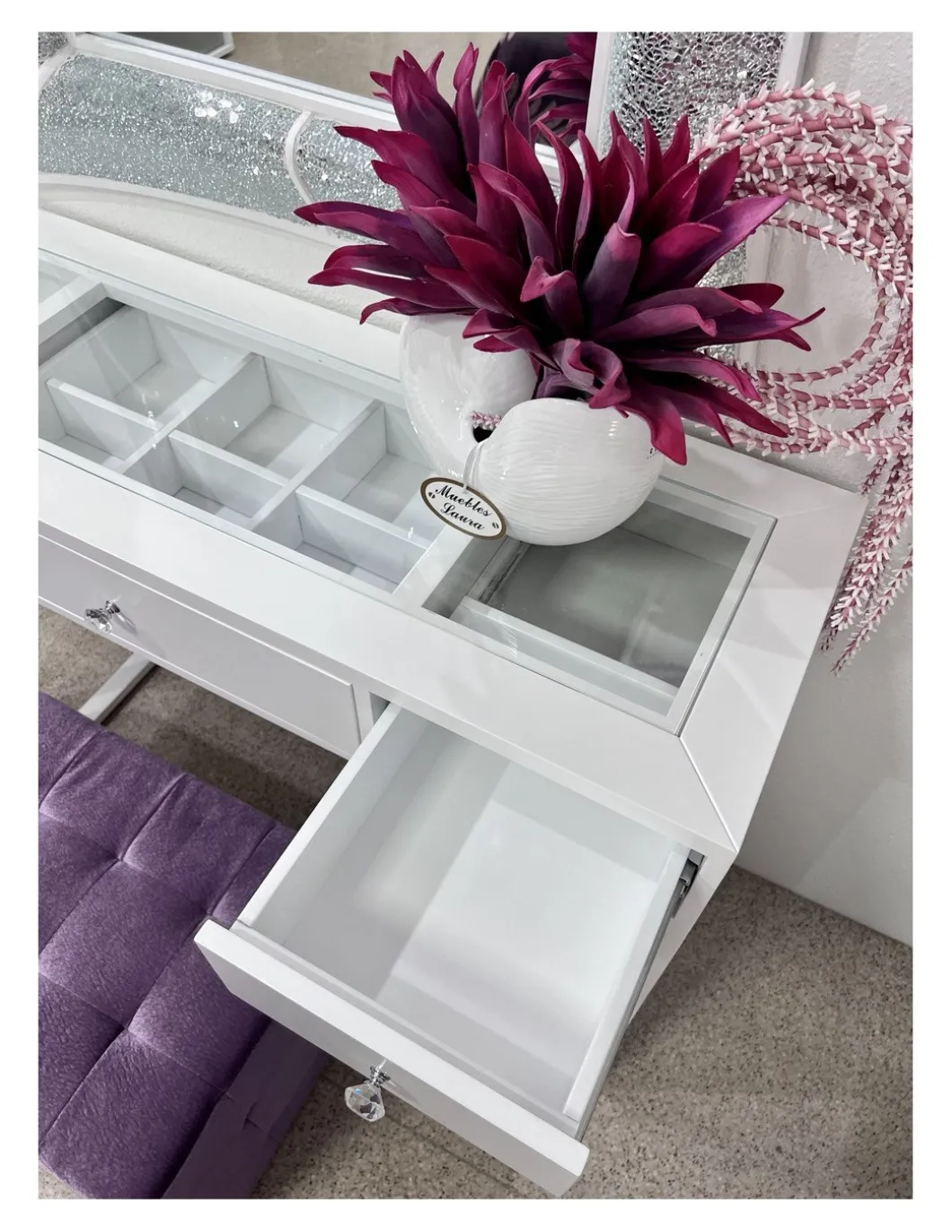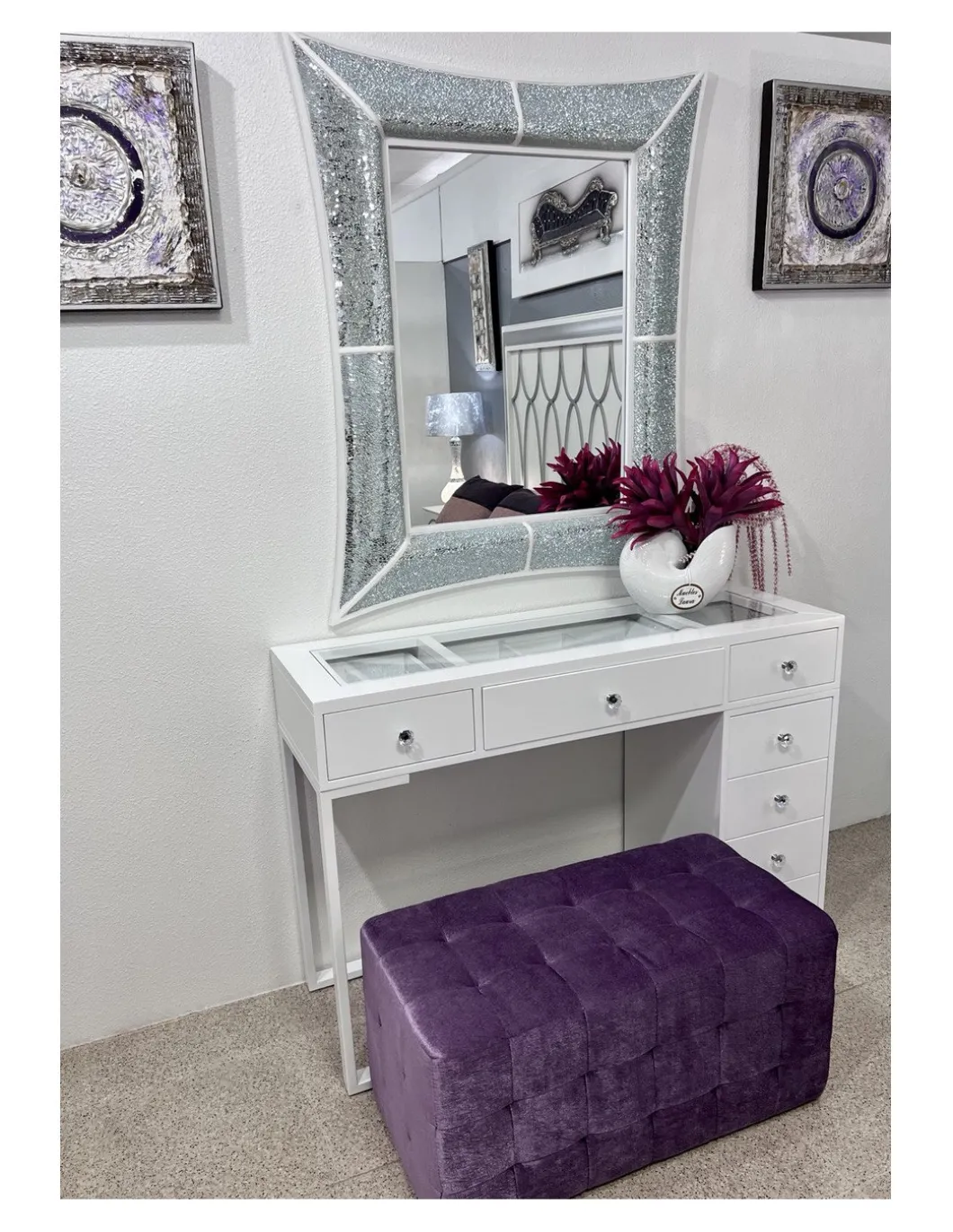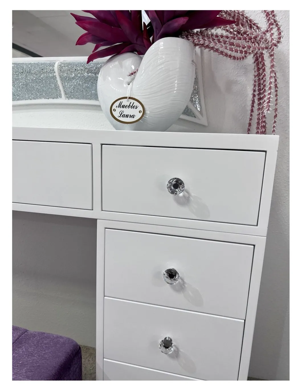 Tocador de maquillaje, tapa de cristal y modulo de cajones lateral con pata metálica.
