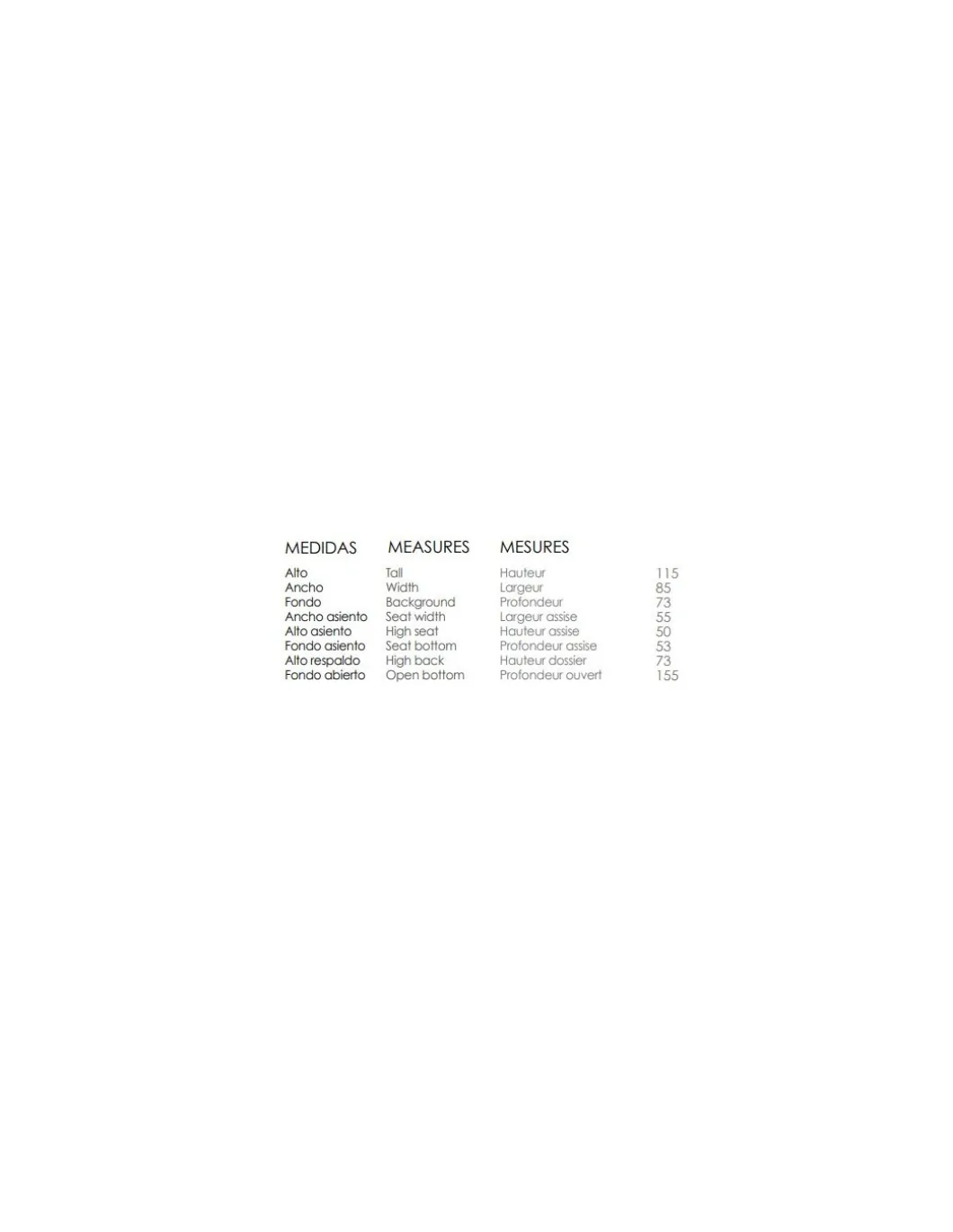 Estructura metálica en respaldo y asiento, brazos en madera. Suspensión de asiento muelles zig zag, y goma HR Suspensión de respaldo cincha gran confort y goma HR Brazos en goma HR Sillón con palanca, 1 ó 2 motores Pie opcional estrella o plato